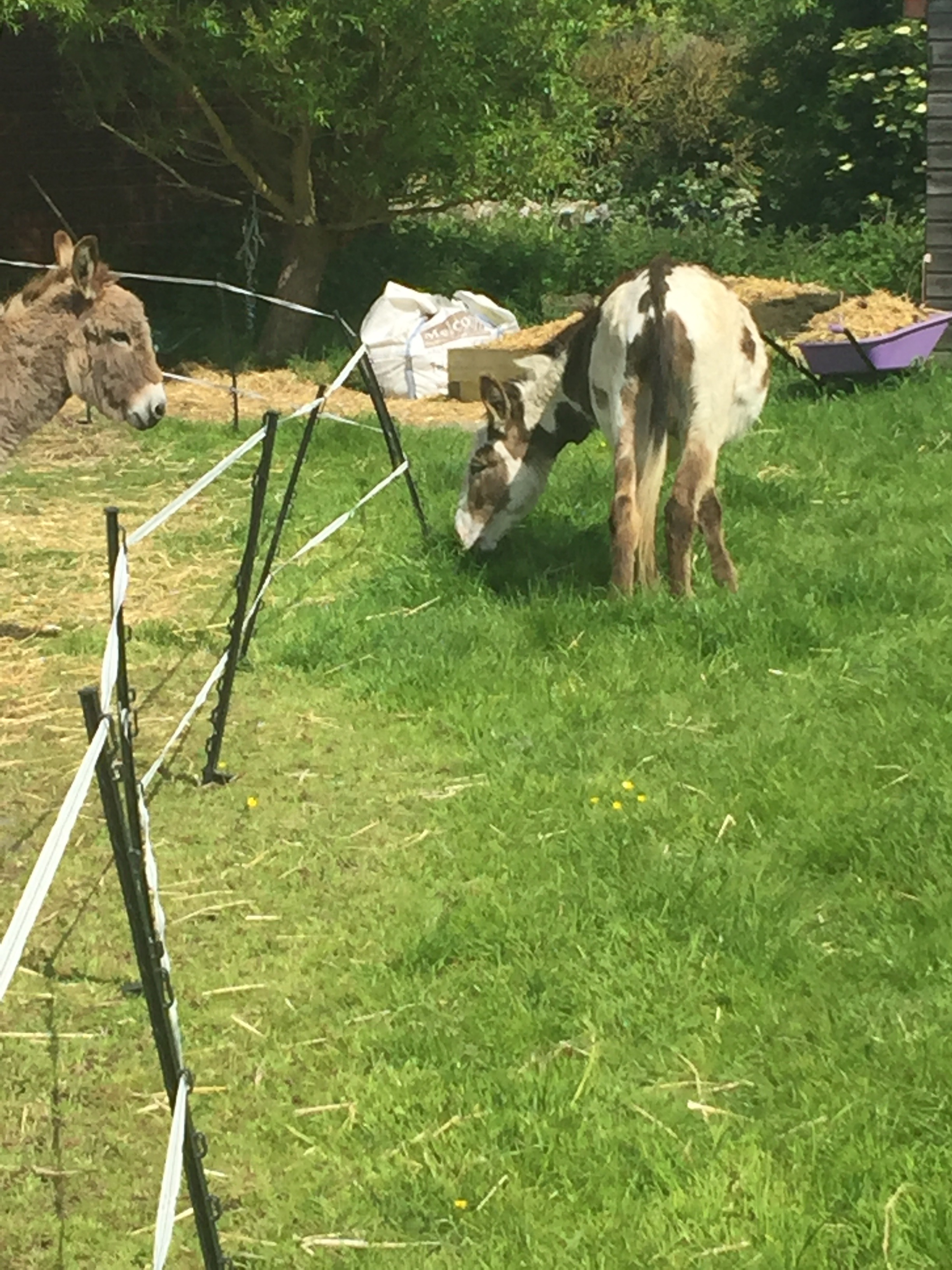Within 2 days George had shown great improvement and by Tuesday this week was back to normal with no swelling in his knee. Great to see. Little lad really stepped up to the mark, not trying to encourage George to run around as he normally would. He also didn’t leave Georges side when the vet was with him. Very brave for a donkey who is wary of new situations.