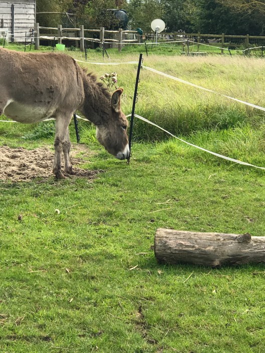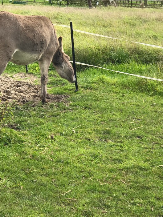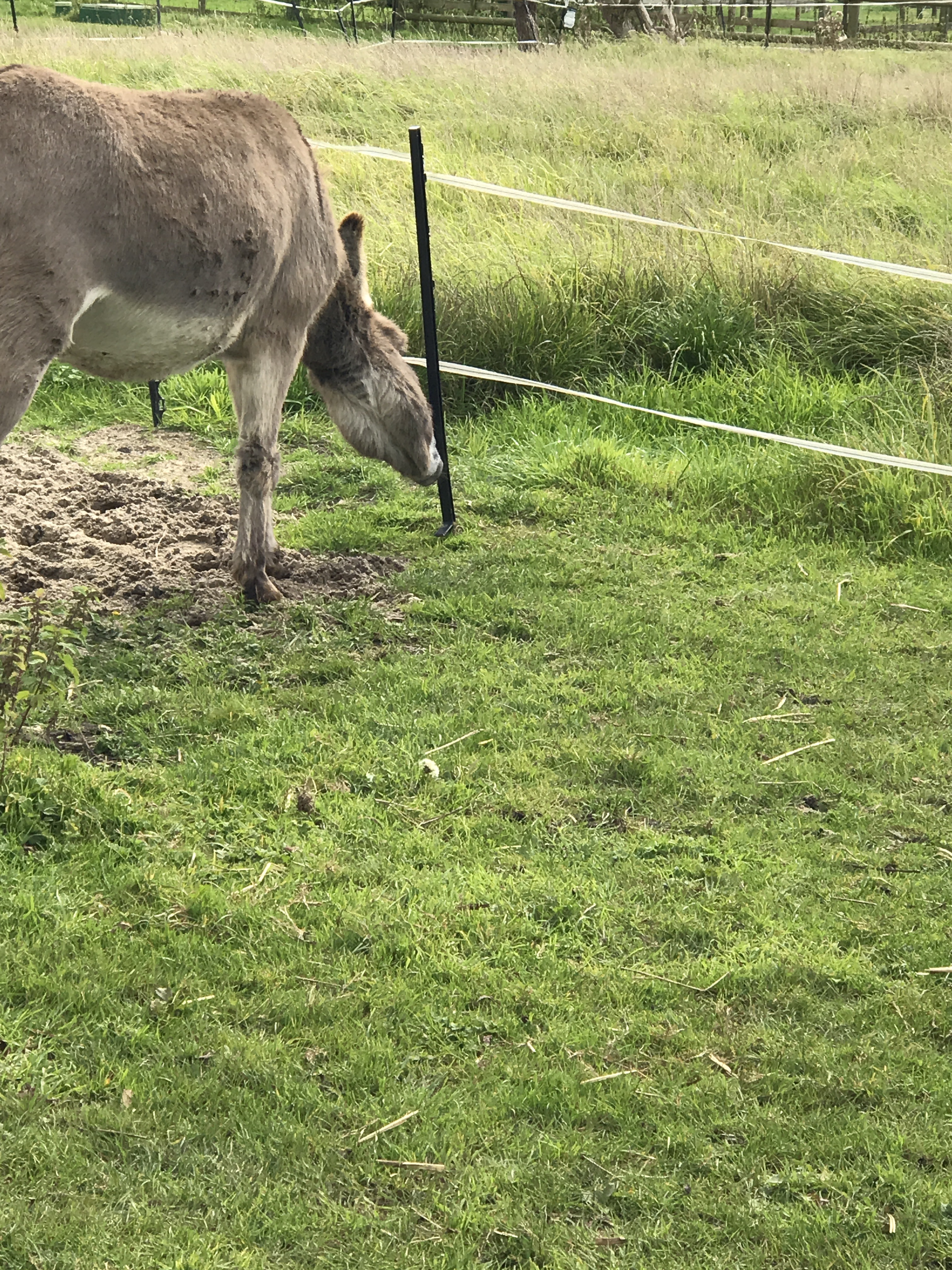 For some time now George had been going around his paddock and lifting the electric fence posts out with his teeth. There is a little peg on them that you stand on to push them into the ground. It is that little peg that he gets his pearly whites around and gently leavers it out the ground. There is no benefit to either him or Little Lad just to do one, so he does two or three in a row. This renders said electric fence useless, as it is now lying on the ground and easy to jump over. When he first started doing this it was just Little Lad who would bound over to new juicy grass and George would stay behind and split on his bestie by braying until someone would come out to see what was going on. However he is being led astray by Little Lad and now follows him into the out of bounds pasture.